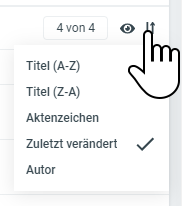Standardmässig wird eine Dossierauflistung so sortiert, dass das zuletzt veränderte Dossier zuerst angezeigt wird. Sie können dies mit Klick auf die beiden Pfeile rechts oben in der Auflistung beliebig ändern.
