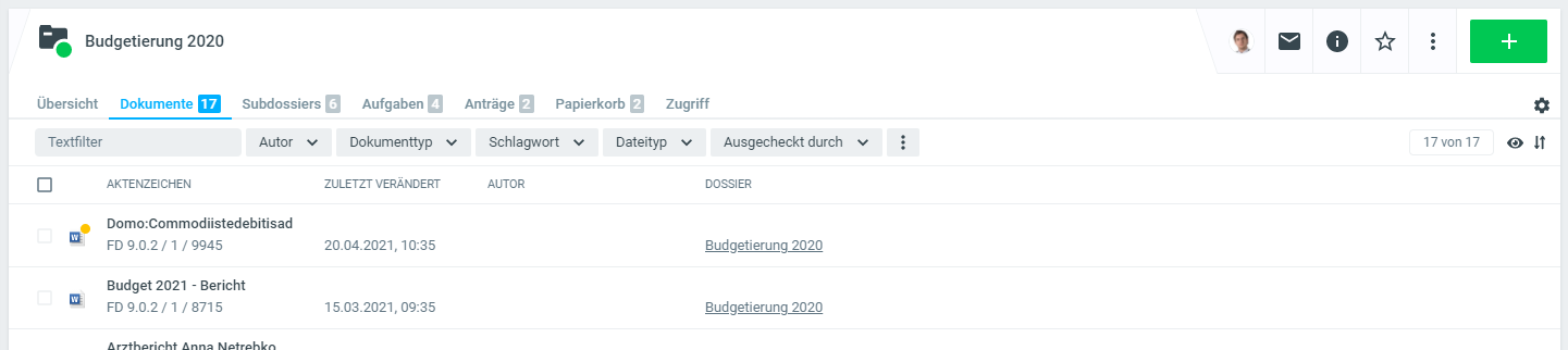 Es stehen Ihnen in einem Dossier unter dem Reiter Dokumente standardmässig eine Reihe von Filtern zur Verfügung: