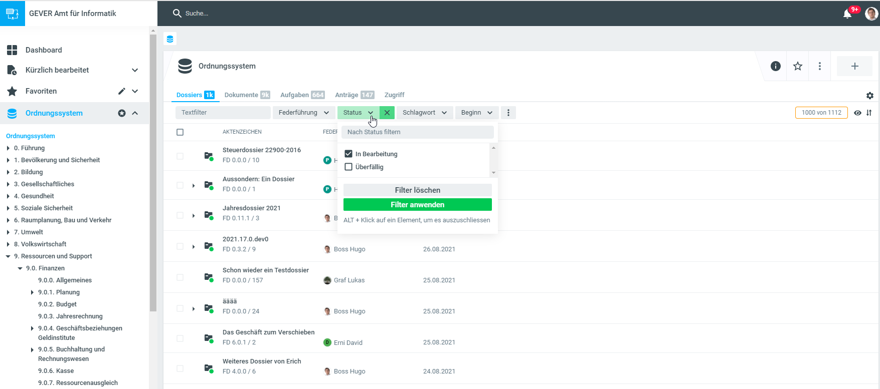 Status: Standardmässig werden Ihnen bei einer Dossierauflistung alle Subdossiers mit dem Status In Bearbeitung angezeigt. Sie können den entsprechenden Filter mittels Entfernung des Hakens zurücksetzen. Dann stehen Ihnen zur Filterung alle Dossiers (mit allen Dossierstati) zur Verfügung.