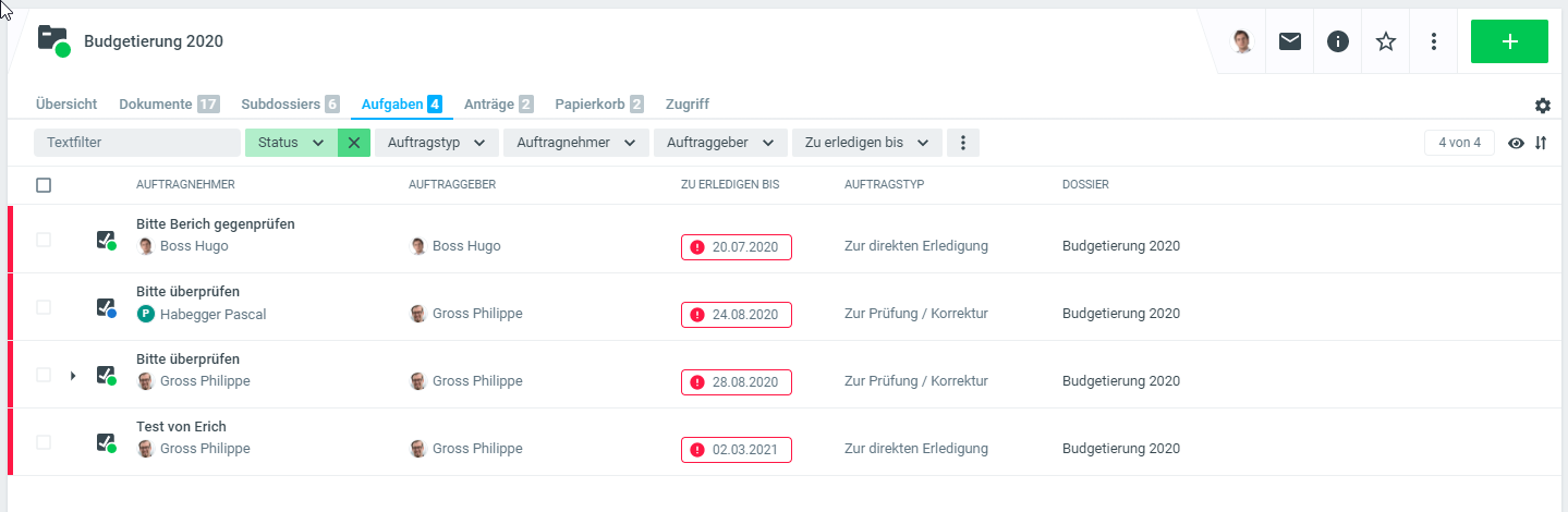 Es stehen Ihnen in einem Dossier unter dem Reiter Aufgaben standardmässig eine Reihe von Filtern zur Verfügung: