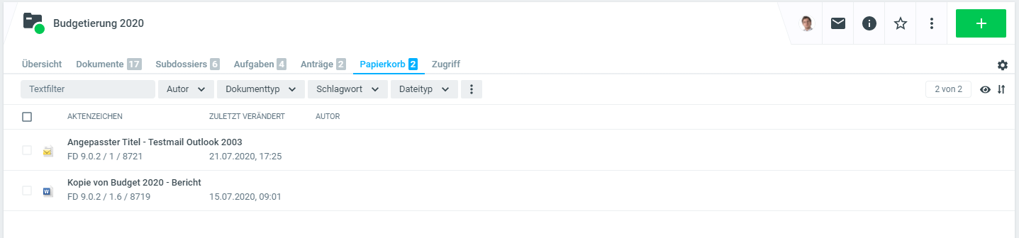 Die Filter- und Sortierfunktionen im Reiter Papierkorb sind analog derjenigen für den Reiter Dokumente.