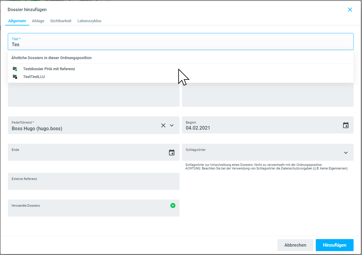 Weitere Informationen zu den Metadaten eines Dossiers finden Sie unter Metadaten im Dossier.