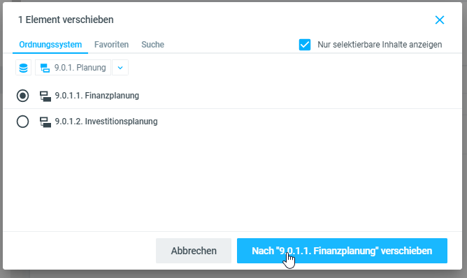 Anschliessend können Sie im Ordnungssystem einen neuen Ablageort selektieren. Für Dossiers sind selbstverständlich nur Rubriken möglich. Wenn Sie die gewünschte Rubrik selektiert haben, klicken Sie auf Nach “1.1.1 Ihre Zielrubrik” verschieben. Anschliessend wird das Dossier verschoben.