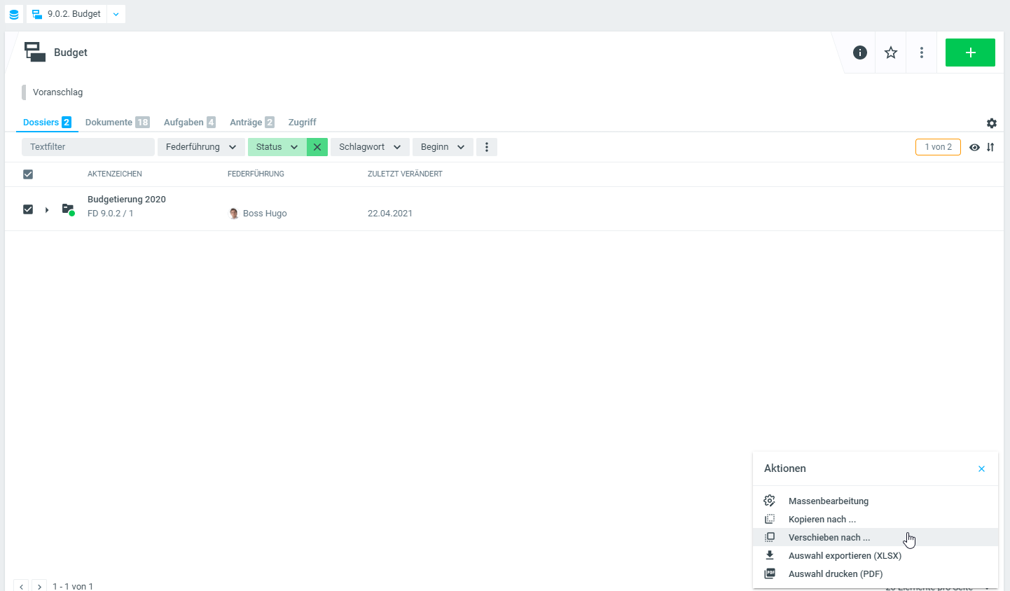 Das Dossier erhält durch das Verschieben ein neues Aktenzeichen!