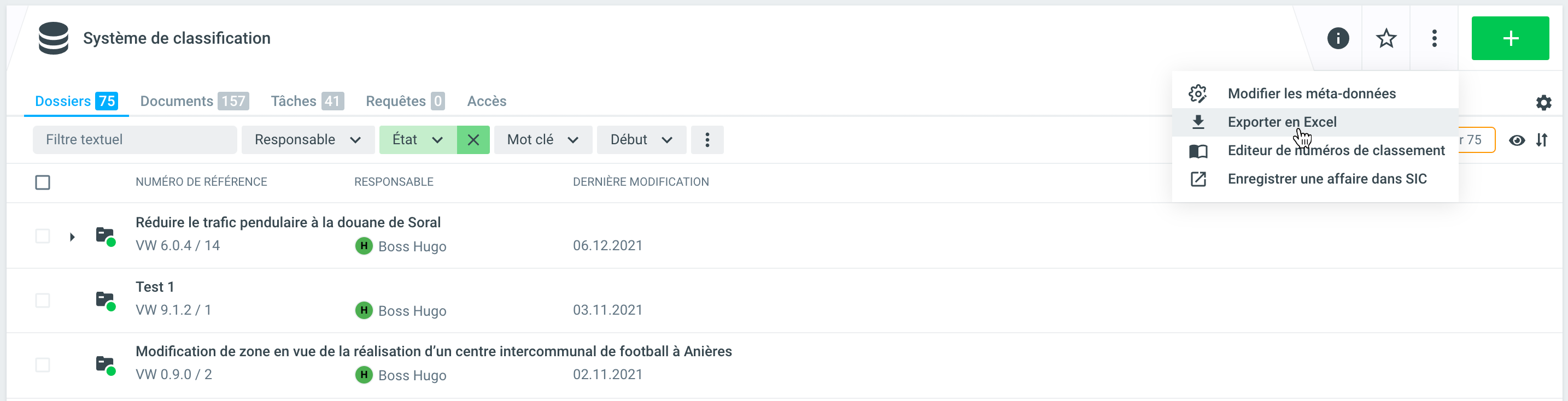 Le système de classement avec toutes les métadonnées et les autorisations peut être exporté sous forme d'Excel au niveau supérieur.