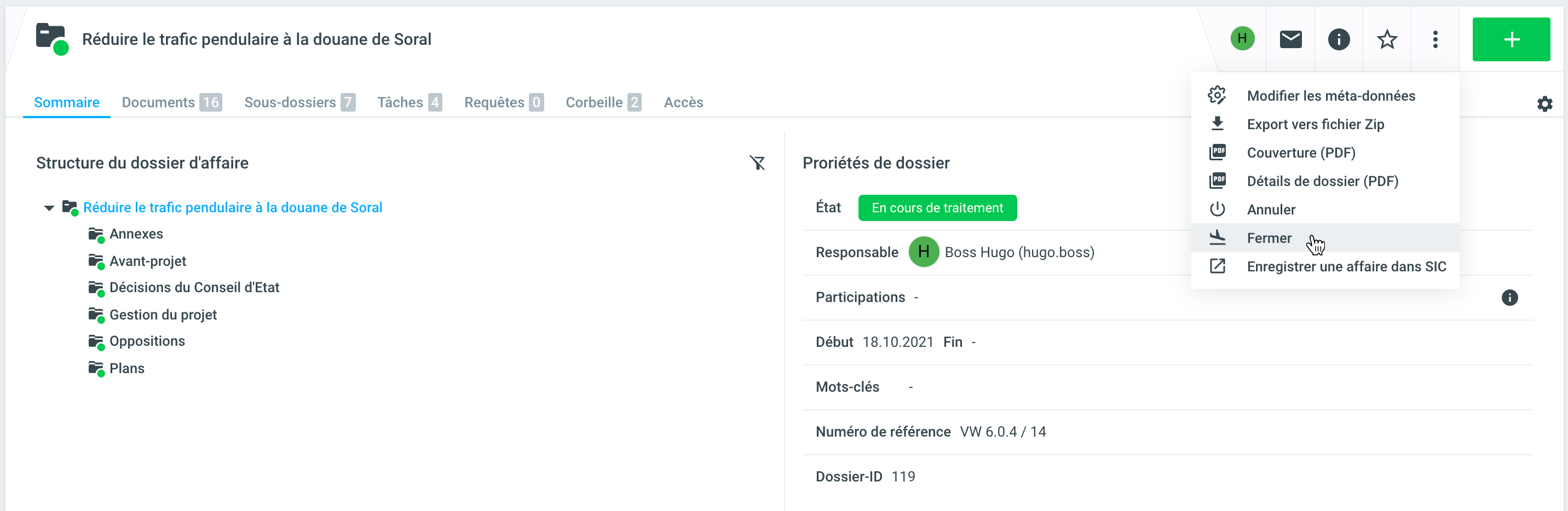 Selon la configuration, l'option de fermeture des dossiers est disponible pour tous les utilisateurs ou seulement pour les collaborateurs spécialement autorisés. Dans ce dernier cas, cette action n'apparaît qu'aux personnes spécialement autorisées.