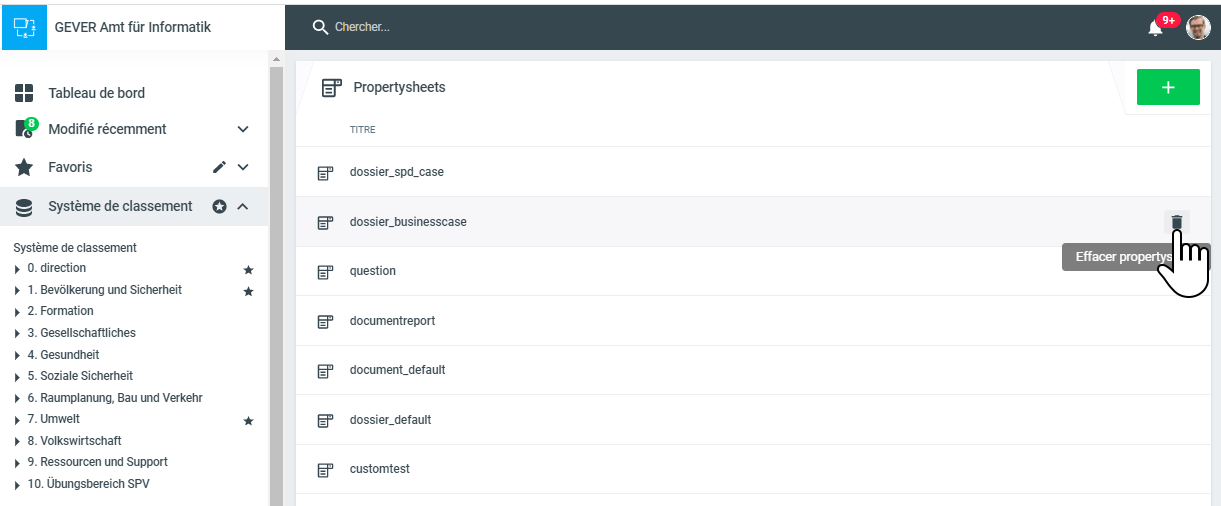 L'édition de Propertysheets ou de champs personnalisés individuels a des conséquences importantes. Les champs définis par l'utilisateur pour lesquels des données ont déjà été saisies sur des objets tels que des dossiers ou des documents ne devraient être supprimés que si les données saisies ne sont plus pertinentes, sinon il y a un risque de perte de données.