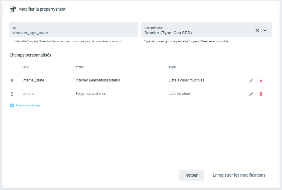 La vue détaillée d'une feuille permet d'ajouter, de modifier ou de supprimer des champs. Il est également possible d'adapter les slots attribués, c'est-à-dire les cas dans lesquels les champs définis par l'utilisateur doivent apparaître.