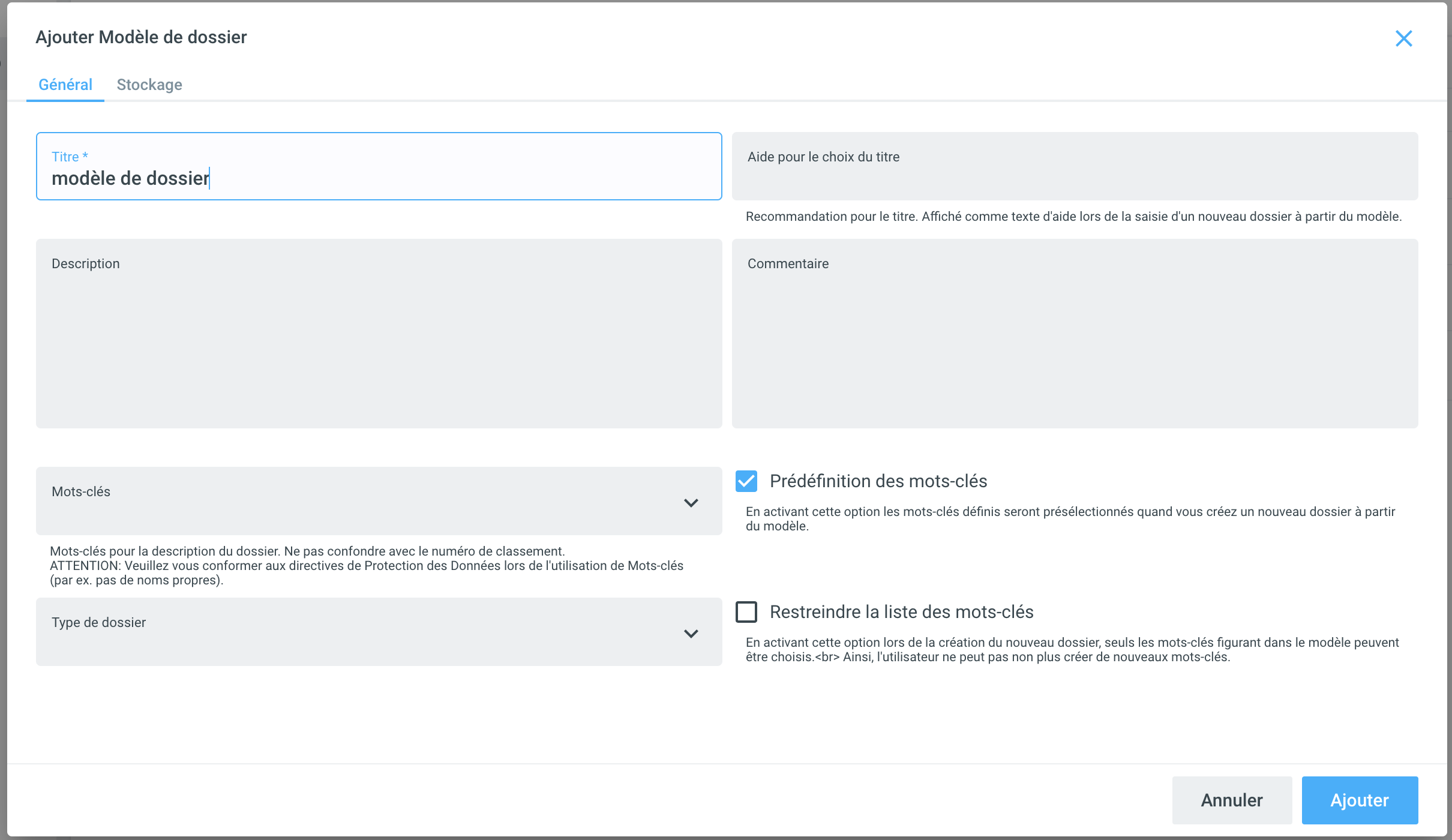 En option, vous pouvez maintenant stocker une aide au titre pour le modèle de dossier (si, par exemple, tous les dossiers avec ce modèle de dossier doivent être étiquetés de la même manière), vous pouvez stocker des mots-clés ou déjà créer des sous-dossiers pour la prédéfinition d'une structure de dossier. Le catalogue de mots-clés prédéfini pour un modèle de dossier peut également être restreint.