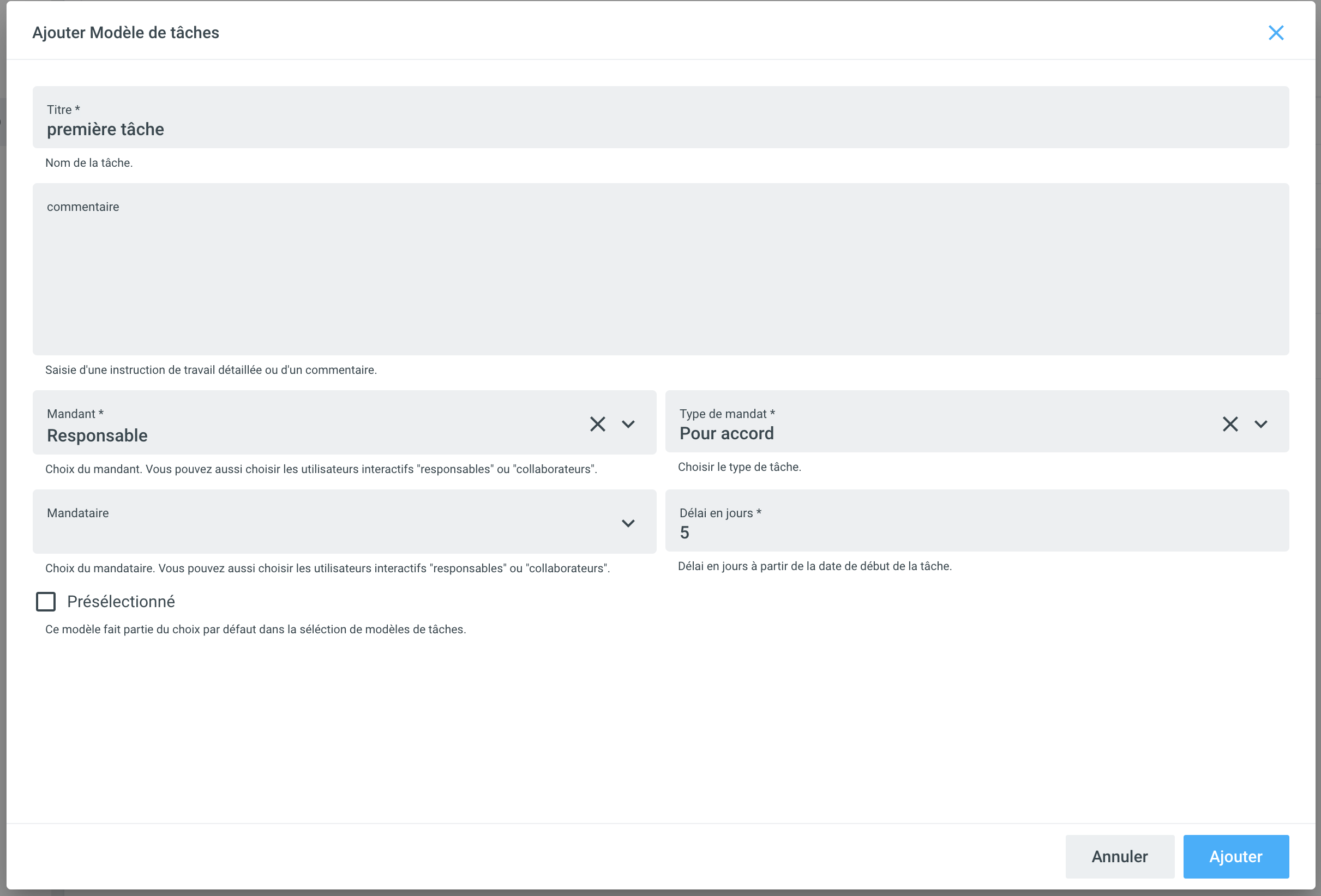 Les mandataires d'un modèle de tâche doivent être compris comme une proposition pour le collaborateur qui déclenche le déroulement standard. Il peut les contourner lors du déclenchement. Il est également possible de ne pas définir de mandataire.