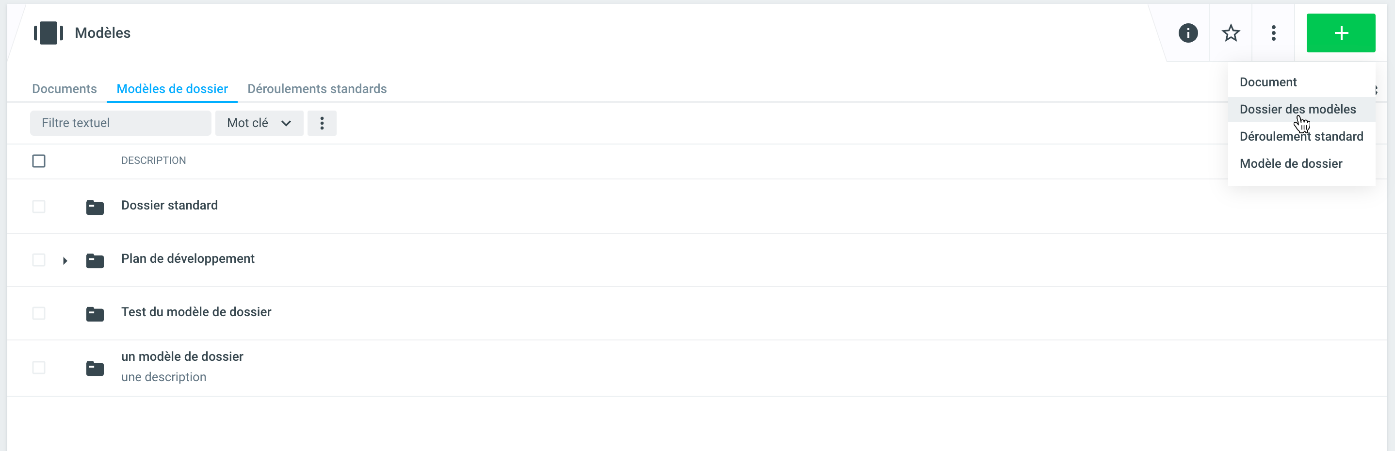 Un déroulement standard doit être activé après avoir été saisi sous les trois points Autres actions afin qu'il apparaisse dans la sélection d'un dossier ou sous-dossier.