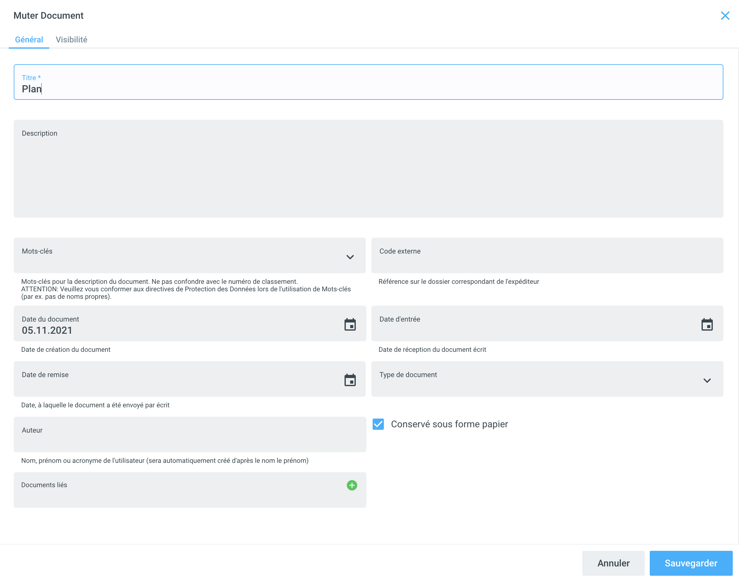 Vous pouvez accéder à la fenêtre de saisie des métadonnées d'un document en cliquant sur le symbole de la roue dentée dans un document existant (soit dans la liste des documents, soit dans la vue détaillée). La même fenêtre apparaît lorsque vous sélectionnez Document après avoir cliqué sur le symbole +. L'écran de saisie est divisé en deux onglets : Général et Visibilité ; l'onglet actif est surligné en bleu.