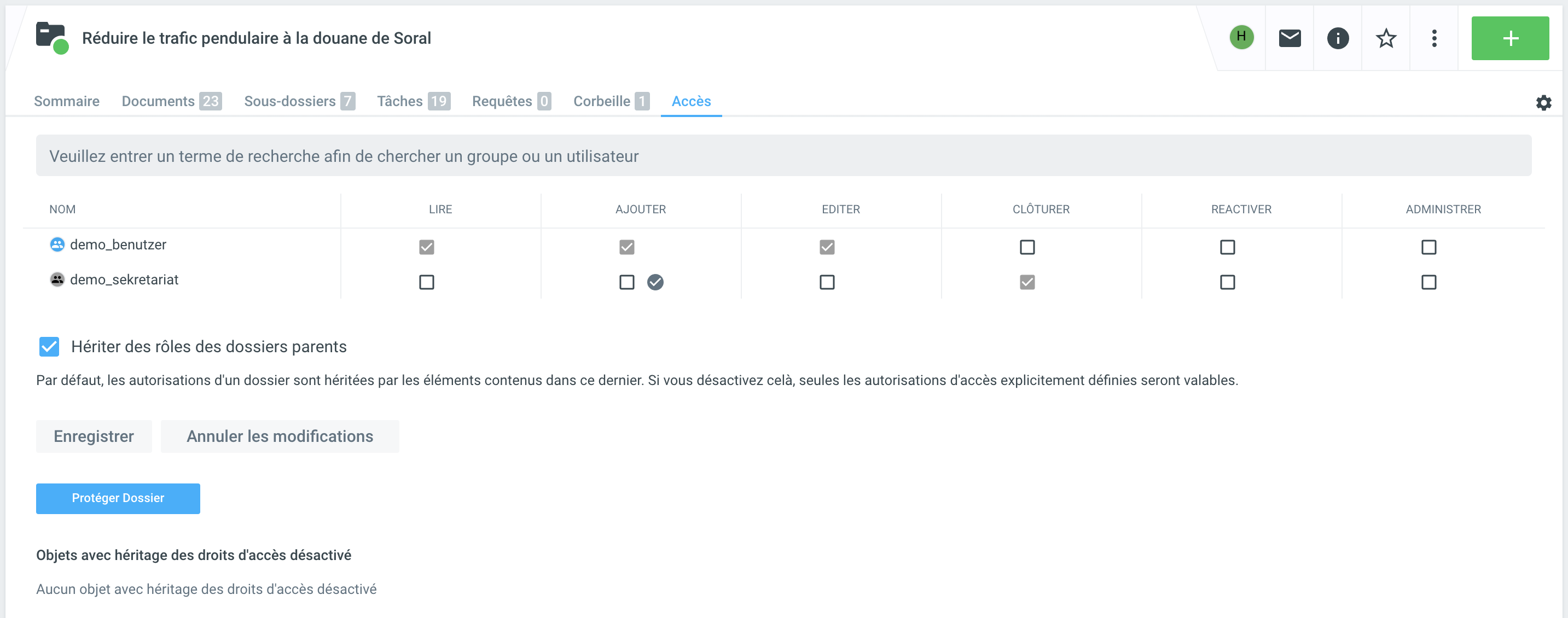 L'ajustement des permissions est très gourmand en ressources pour les gros dossiers ou les rubriques avec de nombreux dossiers attachés. Veuillez utiliser cette fonctionnalité avec la retenue appropriée.