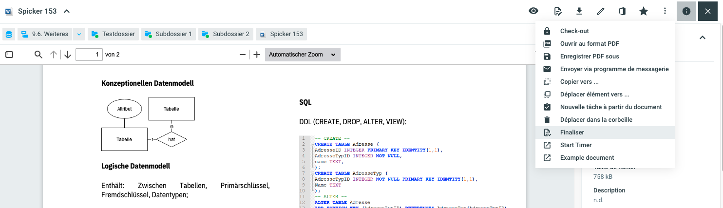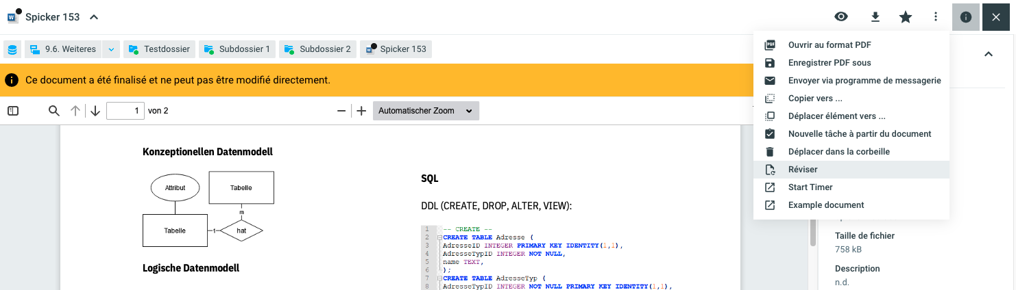 Après avoir traité un document et l'avoir à nouveau archivé, il est possible de finaliser le document. Ce changement de statut a pour conséquence qu'il n'est plus possible de modifier le document. Les documents finalisés peuvent cependant être à nouveau modifiés et adaptés via l'option Réviser.