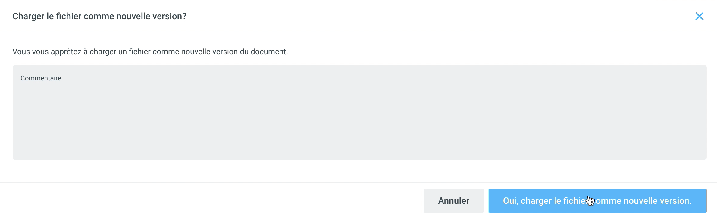 Lorsque vous remplacez le fichier, le message système suivant apparaît. Si nécessaire, vous pouvez y inscrire un commentaire sur la nouvelle version.