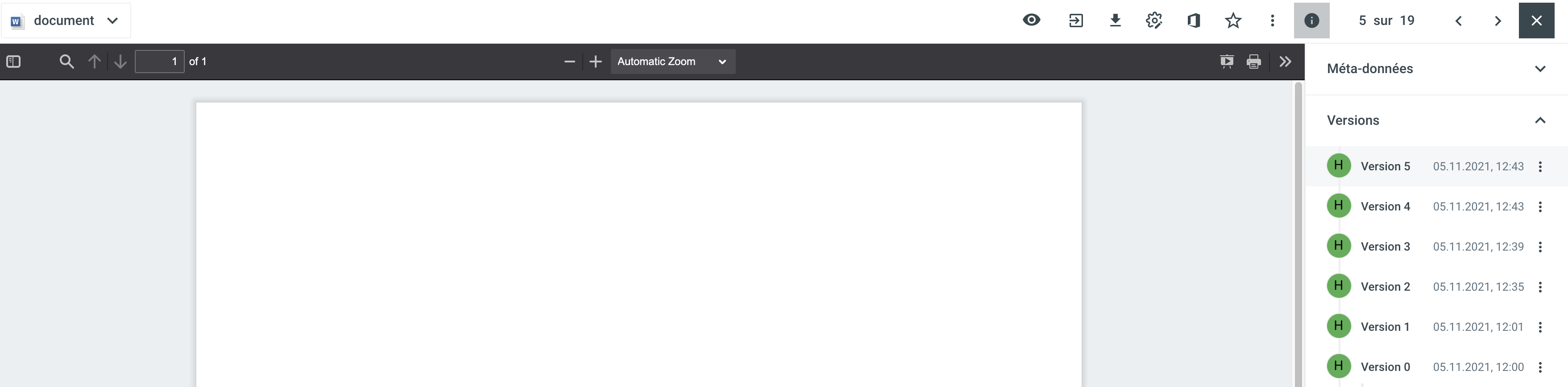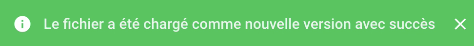 Le document apparaît comme enregistré. Le fichier déposé est répertorié comme une nouvelle version dans les informations sur la version.