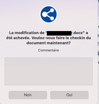 Sauvegardez régulièrement le fichier en cours d'édition, surtout avant de quitter le lieu de travail pour une longue période. Une fois l'édition terminée, veuillez fermer le fichier et l'application (par exemple, Microsoft Word). Lorsque vous avez terminé l'édition, une fenêtre apparaît dans laquelle vous pouvez faire le check-in ( = rendre le document) du document en cliquant sur Oui. Vous recevrez également un message de votre système d'exploitation après l'enregistrement du document.
