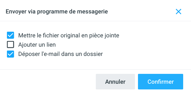 En cliquant sur le symbole de la lettre dans la vue détaillée d'un document, celui-ci peut être envoyé à l'aide du programme de courriel standard. En cliquant dessus, une courte boîte de dialogue s'ouvre. Vous pouvez y définir quels éléments seront envoyés par e-mail (fichier original en annexe et/ou lien) et si l'e-mail correspondant doit être classé directement dans le dossier par envoi d'e-mail. L'envoi du mail est documenté dans le journal.