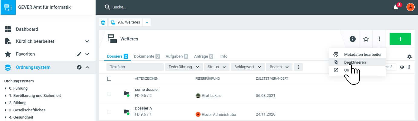 Wenn Sie verhindern möchten, dass an einer Ordnungsposition weiterhin Dossiers angelegt werden können, können Sie diese deaktivieren. Die bereits an dieser Position befindlichen Dossiers bleiben dabei weiterhin gemäss den Berechtigungen im Ordnungssystem im Zugriff erhalten. Klicken Sie dazu in der betreffenden Ordnungsposition auf die drei Punkte (=Weitere Aktionen) und dann auf den Befehl Deaktiveren.