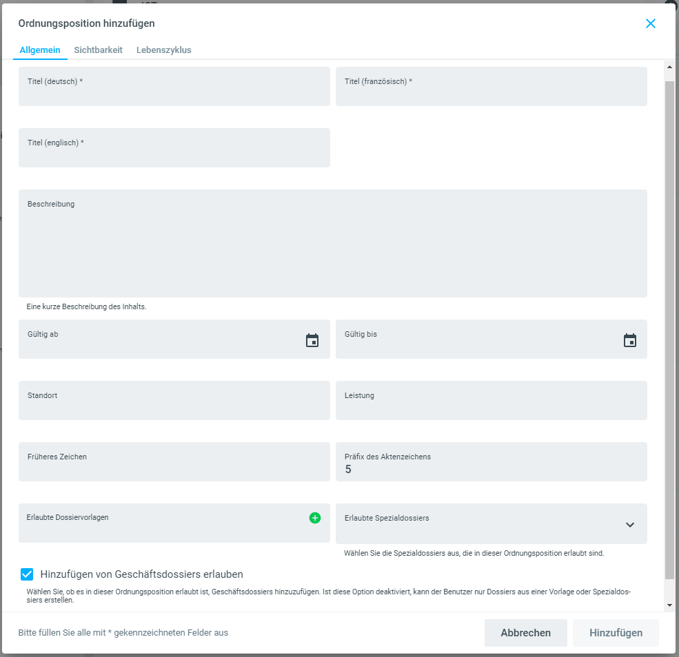 Ordnungspositionen können nur gelöscht werden, wenn darunter keine Dossiers oder weitere Ordnungspositionen liegen. Ansonsten ist der Menüpunkt Löschen nicht ersichtlich.