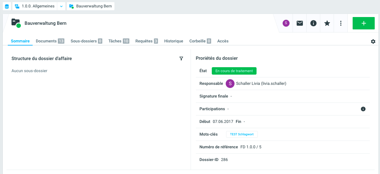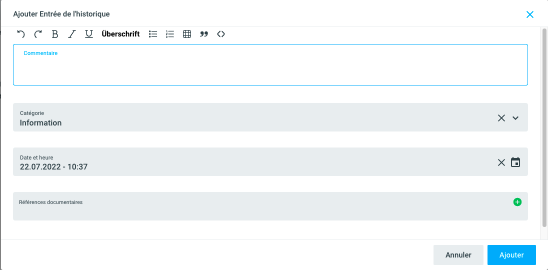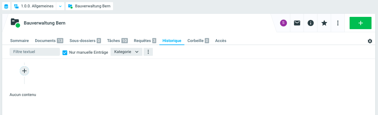 Le journal indique qui a apporté quelles modifications au dossier et à quel moment. Le journal sert à la traçabilité. Il peut être modifié en y apportant manuellement des compléments, comme par exemple l'ajout de fichiers MSG (rendez-vous Outlook).
