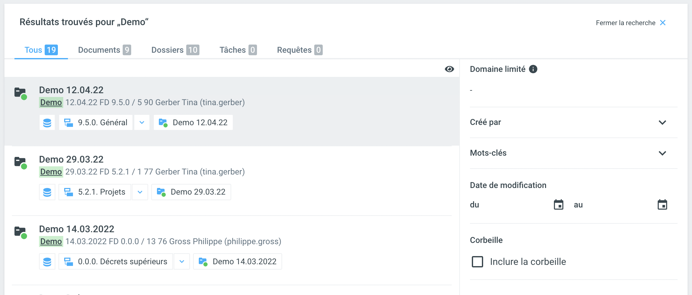 Pour les installations de Fabasoft OneGov avec plusieurs mandants, il faut tenir compte du fait que la recherche est limitée au mandant actuel.