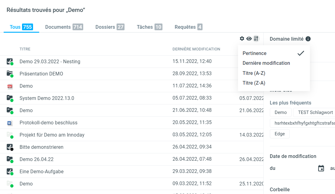Dans la vue tableau, les résultats de la recherche peuvent être triés par pertinence, par ordre alphabétique ou par les dernières entrées modifiées. Après avoir saisi une nouvelle requête de recherche, le tri actuellement défini est conservé et ne sera réinitialisé que si l'on quitte la recherche et que l'on navigue vers un autre lieu.