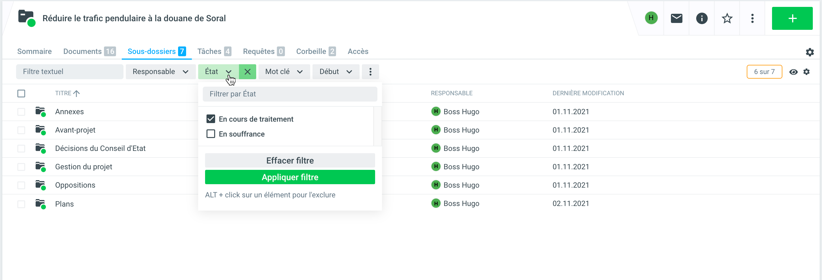Etat: Par défaut, tous les sous-dossiers dont le statut estEn cours de traitementsont affichés dans la liste des dossiers. Vous pouvez réinitialiser le filtre correspondant en retirant la coche. Ensuite, tous les dossiers (avec tous les états de dossier) sont disponibles pour le filtrage.