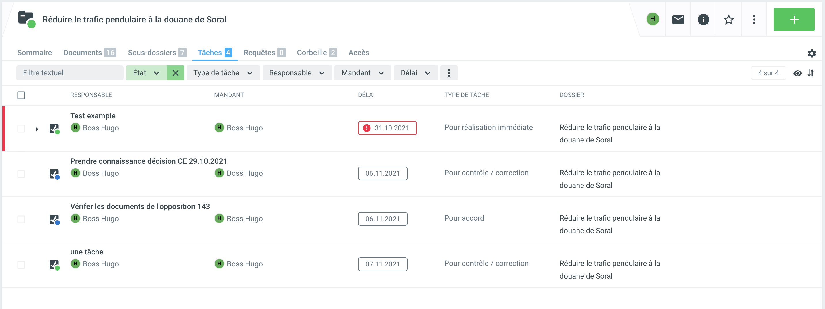 Responsable: Filtrer la liste en fonction du responsable.Mots-clés: Filtre la liste en fonction des mots-clés attribués dans le système.Début: Filtre la liste en fonction de la date de début de l’affaire ou du dossier. Des paramètres de filtre prédéfinis sont disponibles.Filtre textuel: Le filtre texte permet d'effectuer une recherche en texte intégral dans la liste affichée. Les résultats sont immédiatement visibles.