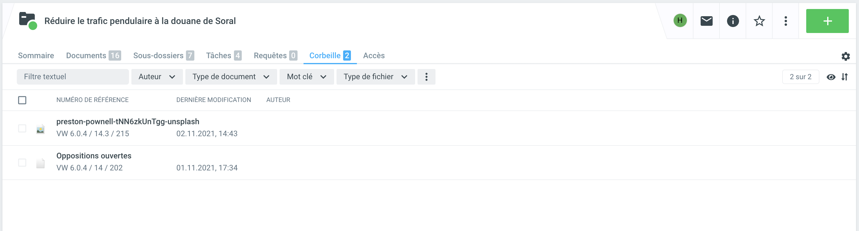 Les fonctions de filtrage et de tri de l'onglet Corbeille sont analogues à celles de l'onglet Documents.