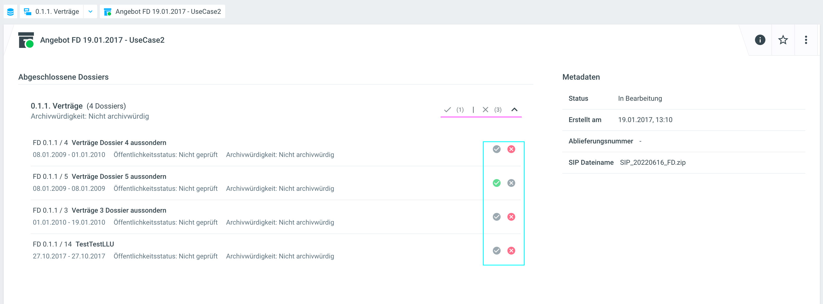 Als Person mit der Rolle Archivist können Sie nun die Bewertung des Angebots vornehmen. Dabei handelt es sich um den Entscheid, ob ein Dossier archiviert werden soll oder nicht: