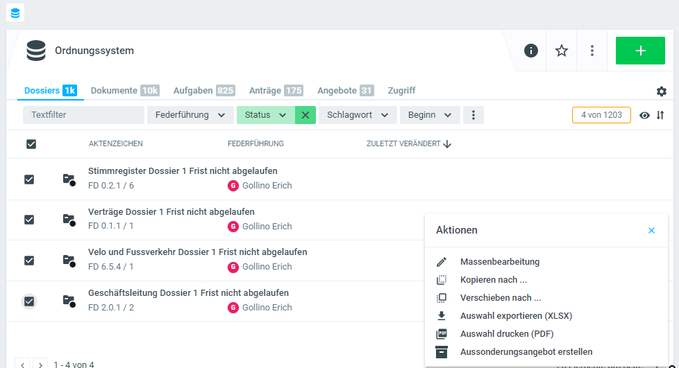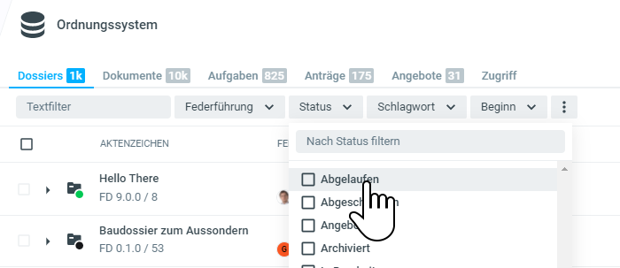 Eine Übersicht über abgelaufene Dossiers, also Dossiers, welche für eine Aussonderung in Frage kommen, bietet der Status-Filter abgelaufen welcher für Personen mit der Rolle Records Manager auf allen Dossierauflistungen zur Verfügung steht.
