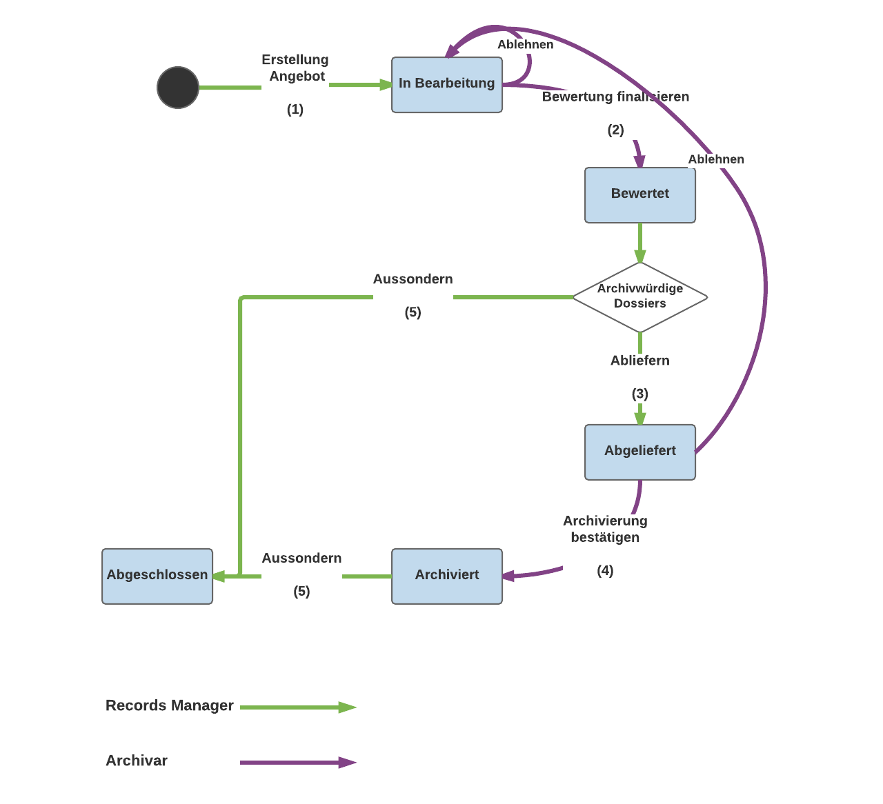 Beim Angebot handelt es sich um einen separaten Inhaltstypen, der neben zusätzlichen Metadaten vor allem die Referenzen auf die entsprechenden Dossiers führt. Das Angebot-Objekt stellt zudem den kompletten Aussonderungs-Workflow zur Verfügung. Dieser setzt sich aus den folgenden Übergängen zusammen: