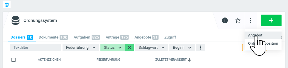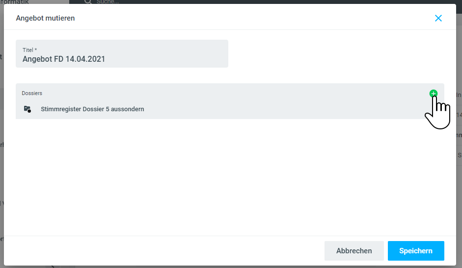 Mit der Funktion Angebot können direkt Angebote aus einer Dossierauflistung inkl. Dossiers erstellt werden.