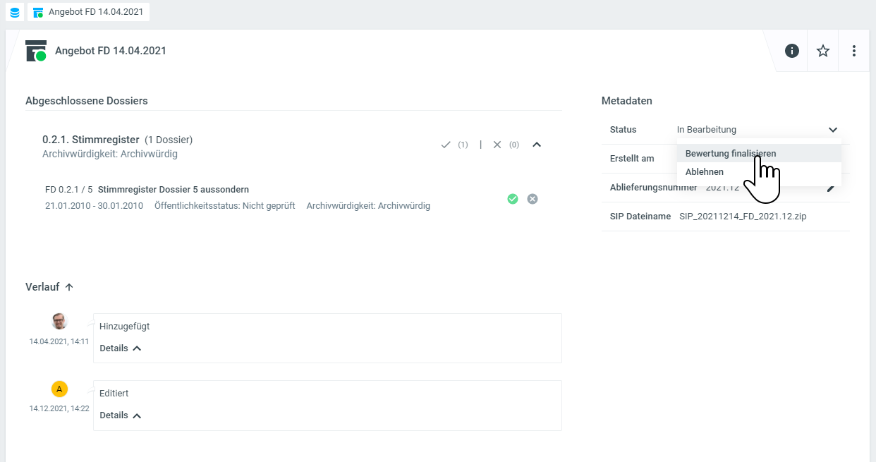 Wurde die Bewertung durch das Archiv vorgenommen, kann die Bewertung finalisiert werden. Dabei wird das Angebot in den Status bewertet versetzt und kann nicht mehr bearbeitet bzw. angepasst werden. Um den Statuswechsel durchzuführen, wählen Sie als Person mit der Rolle Archivist unter Status den Befehl Bewertung finalisieren.