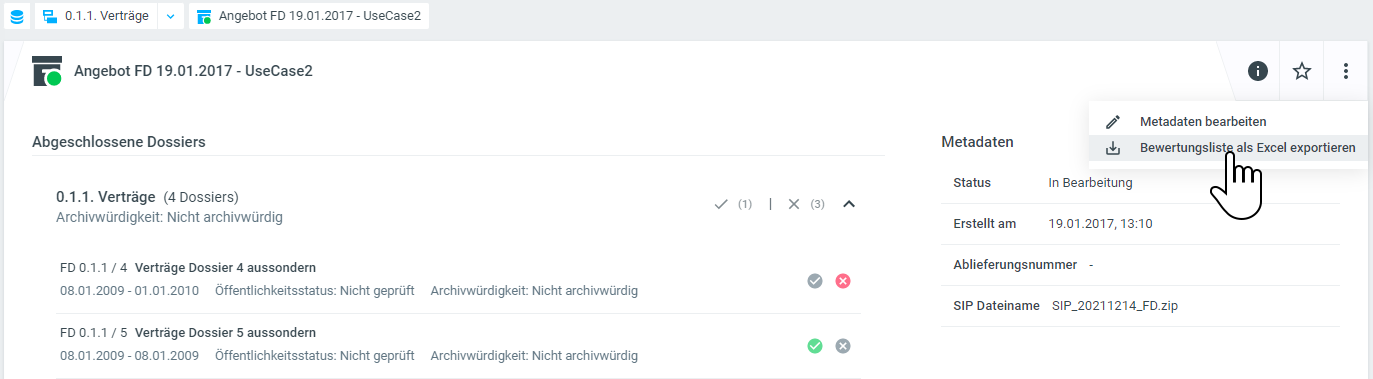 Wurde ein Angebot erstellt, befindet es sich im Status In Arbeit. In diesem Status können die Metadaten des Angebots, wie auch die enthaltenen Dossiers, noch bearbeitet werden. Klicken Sie dazu auf die drei Punkte (=Weitere Aktionen) und dann auf Metadaten bearbeiten.