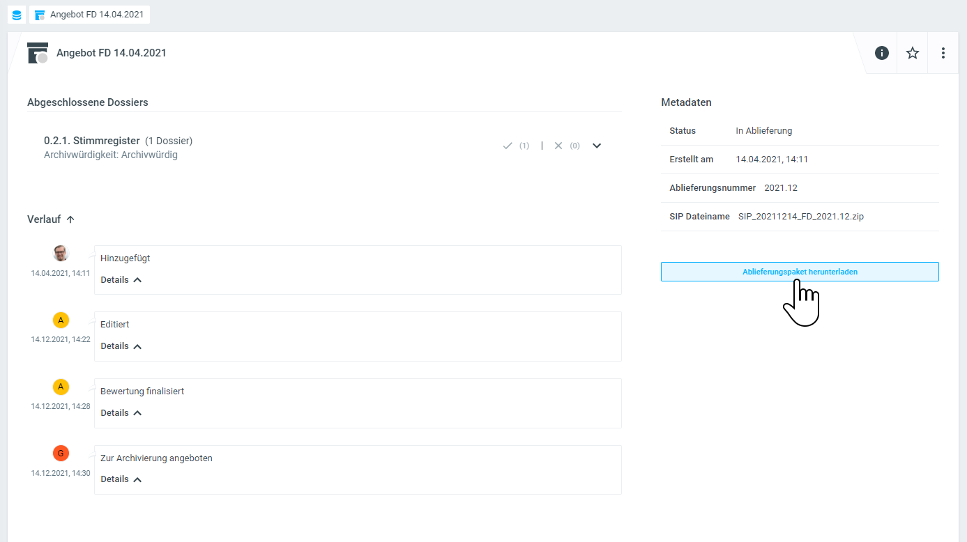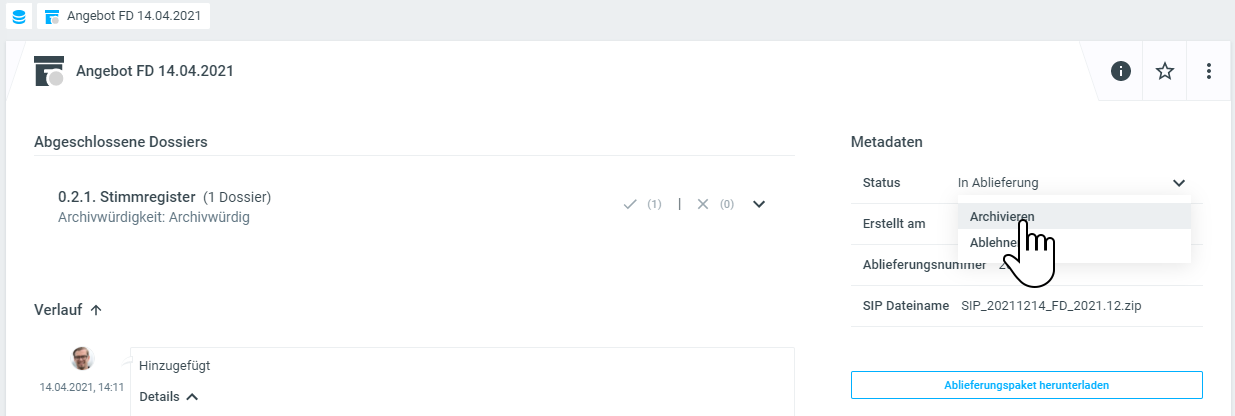 Anschliessend kann das Angebot abgeliefert werden. Dazu wählen Sie als Person mit der Rolle Records Manager unter Status den Befehl Abliefern. Danach steht auch die Aktion Ablieferungspaket herunterladen zur Verfügung, welches den eCH-0160 Export für die enthaltenen Dossiers mit einer positiven Bewertung zum Download anbietet (Menüpunkt Ablieferungspaket herunterladen).