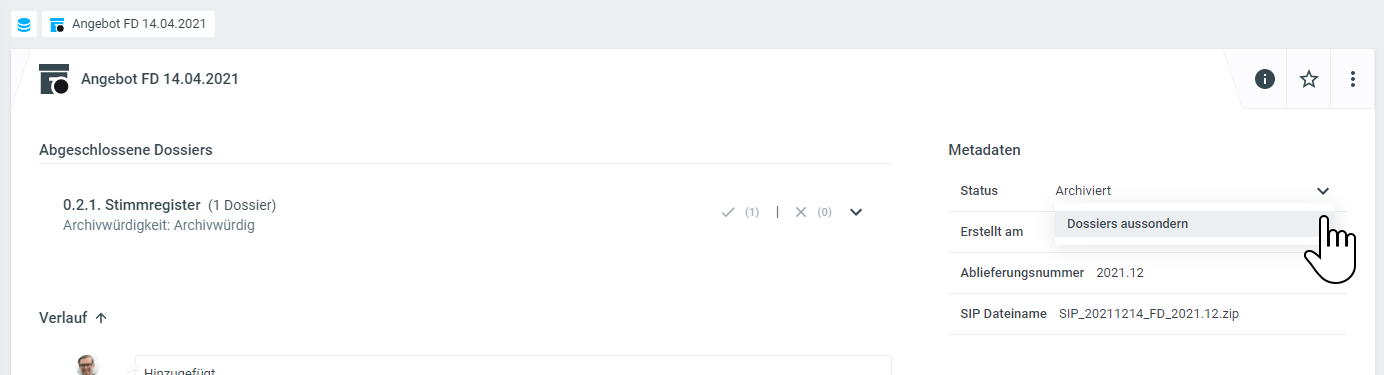 Der Prozess der Aussonderung wird mit der Vernichtung der Dossiers abgeschlossen. Dabei werden alle im Angebot enthaltenen Dossiers vernichtet, also effektiv aus dem System gelöscht. Dieser Schritt kann von Personen mit der Rolle Records Manager ausgeführt werden. Klicken Sie dazu unter Status auf den Befehl Dossiers aussondern.