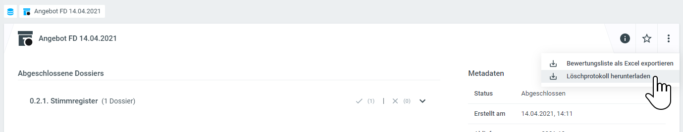 Nach Abschluss des Angebots, also nach der Vernichtung der Dossiers, besteht zudem die Möglichkeit ein automatisch generiertes Löschprotokoll herunterzuladen. Sie finden den entsprechenden Menüpunkt unter den drei Punkten (=Weitere Aktionen).