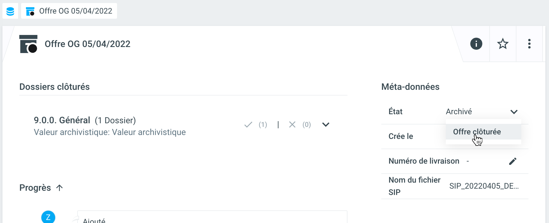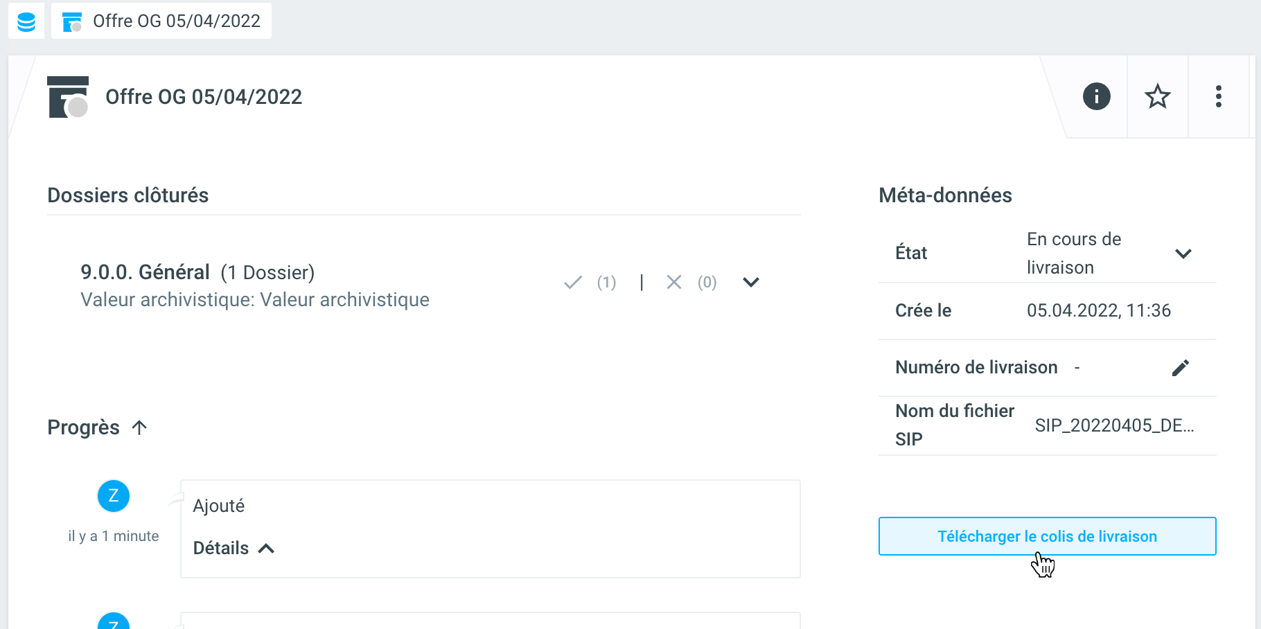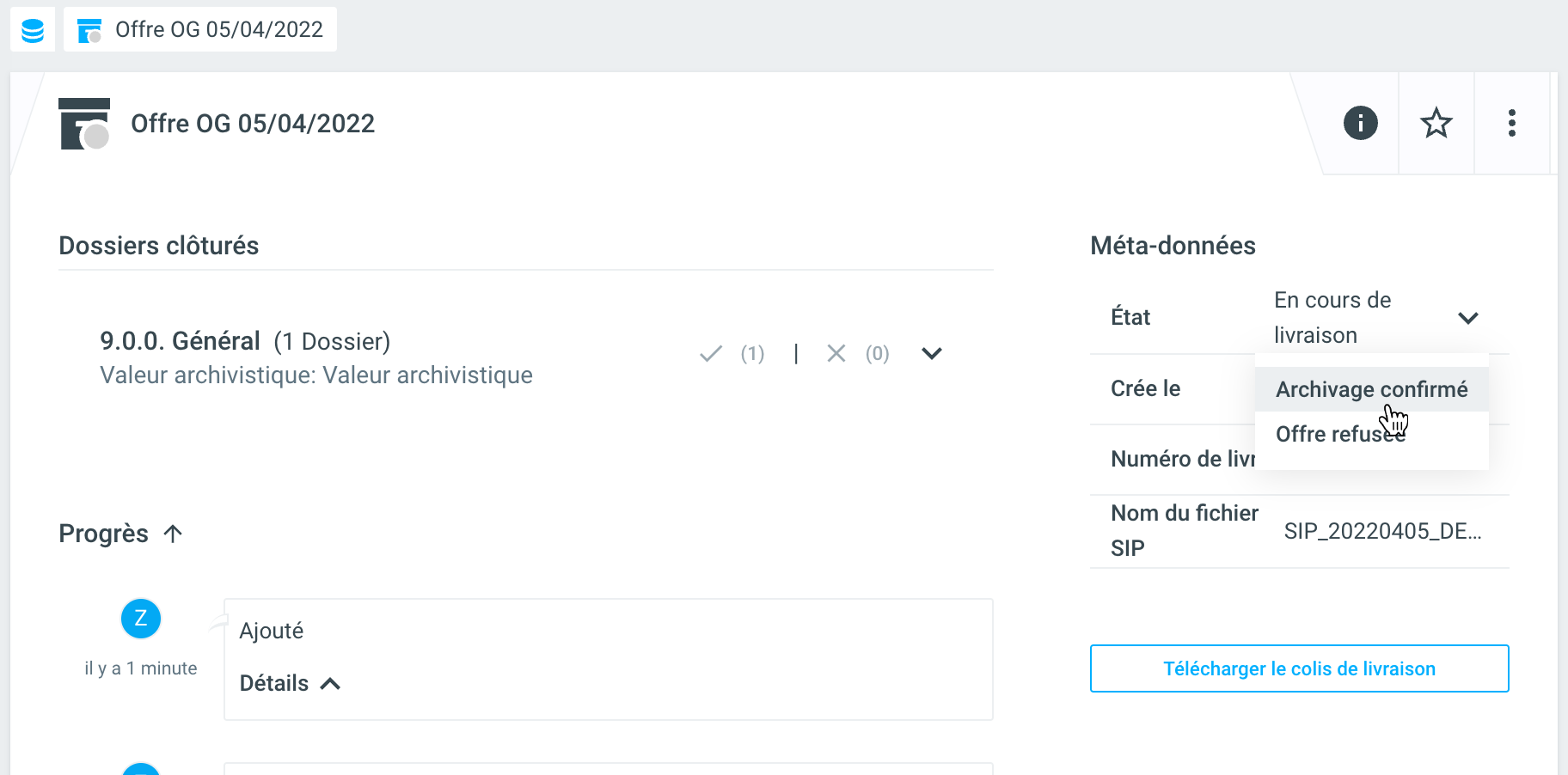 L'offre peut ensuite être livrée. Pour ce faire, sélectionnez, en tant que personne ayant le rôle de Records Manager, la commande Livrer sous Statut. Ensuite, l'action Télécharger le paquet de livraison est également disponible et propose de télécharger l'exportation eCH-0160 pour les dossiers contenus avec une évaluation positive (point de menu Télécharger le paquet de livraison).