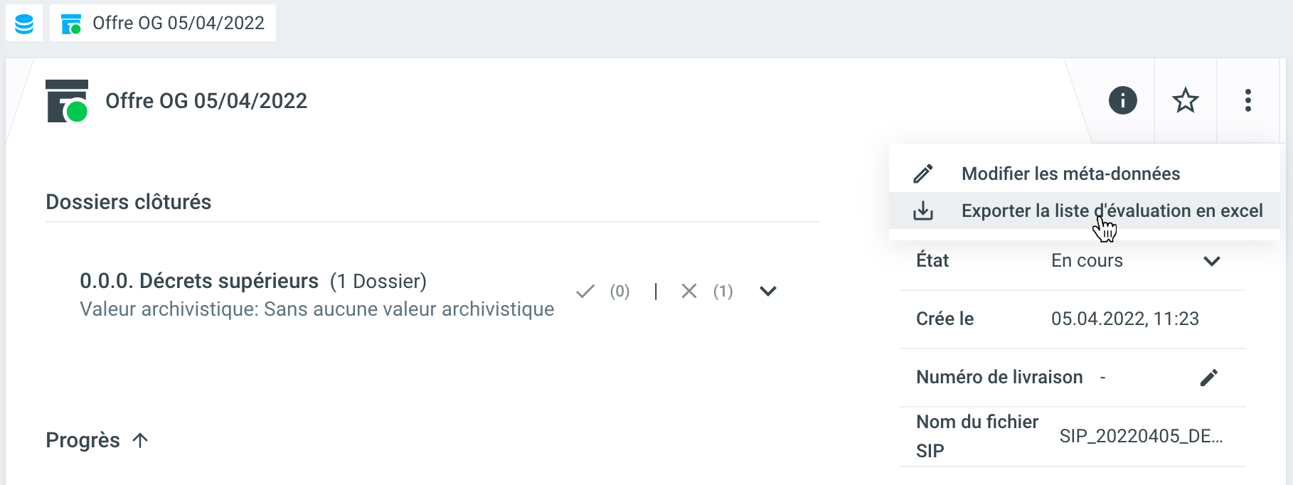 Si une requête a été créée, elle se trouve dans le statut En cours. Dans ce statut, les métadonnées de l'offre, ainsi que les dossiers qu'elle contient, peuvent encore être modifiés. Pour ce faire, cliquez sur les trois points (= autres actions) et ensuite sur Modifier les métadonnées.