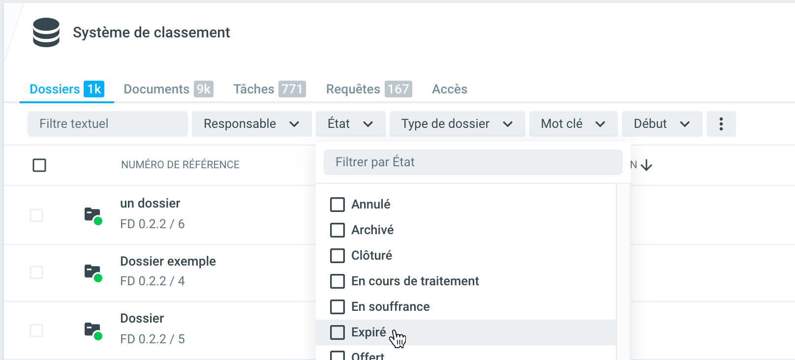 Le filtre de statut, disponible sur toutes les listes de dossiers pour les personnes ayant le rôle de Records Manager, offre un aperçu des dossiers expirés, c'est-à-dire des dossiers qui entrent en ligne de compte pour une élimination.