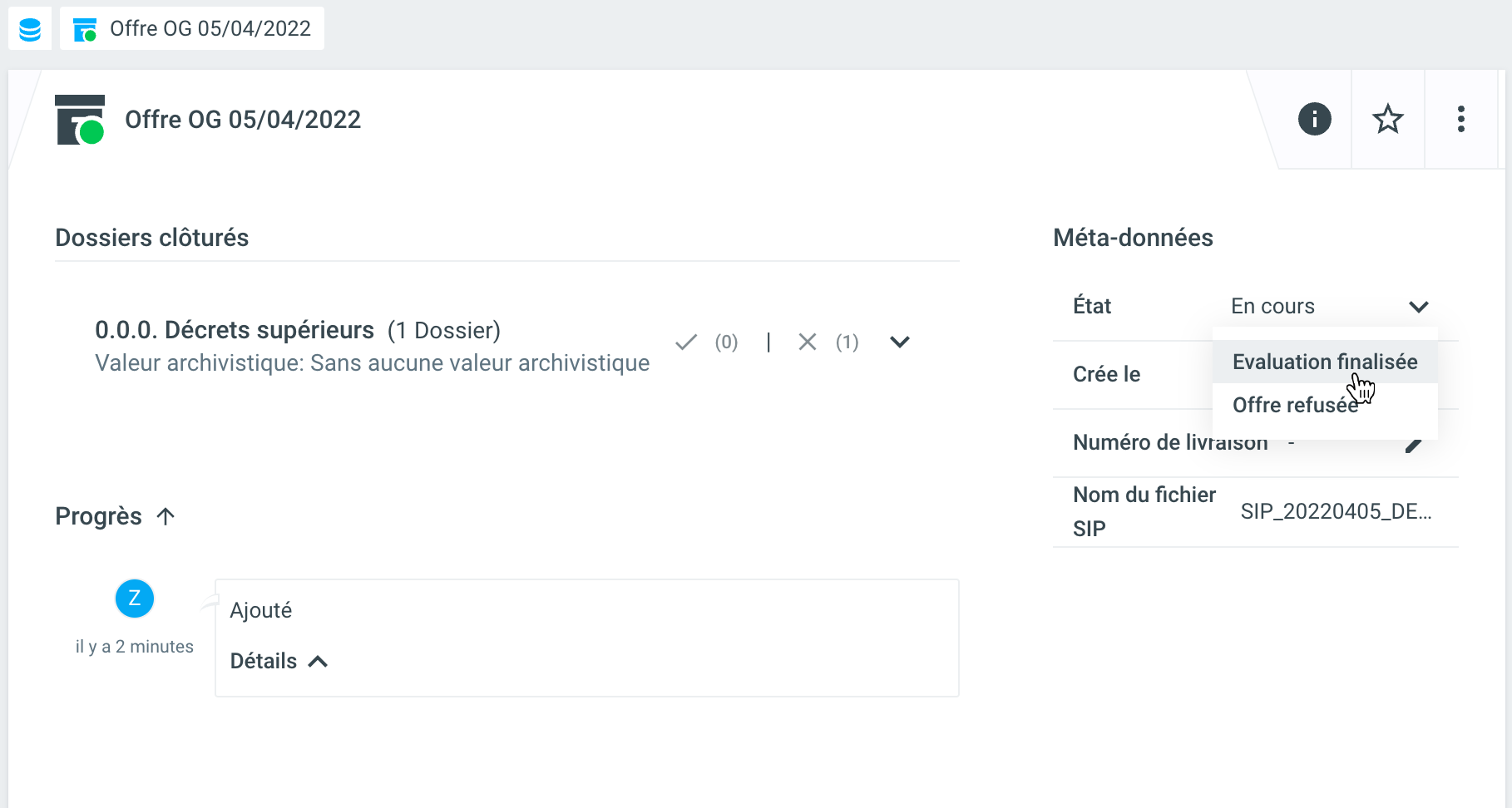 Les dossiers annulés sont repris dans une liste séparée. La pré-évaluation automatique sur la base de la métadonnée de valeur archivistique du dossier est également supprimée. Les dossiers annulés sont toujours pré-évalués comme n'ayant pas de valeur archivistique.
