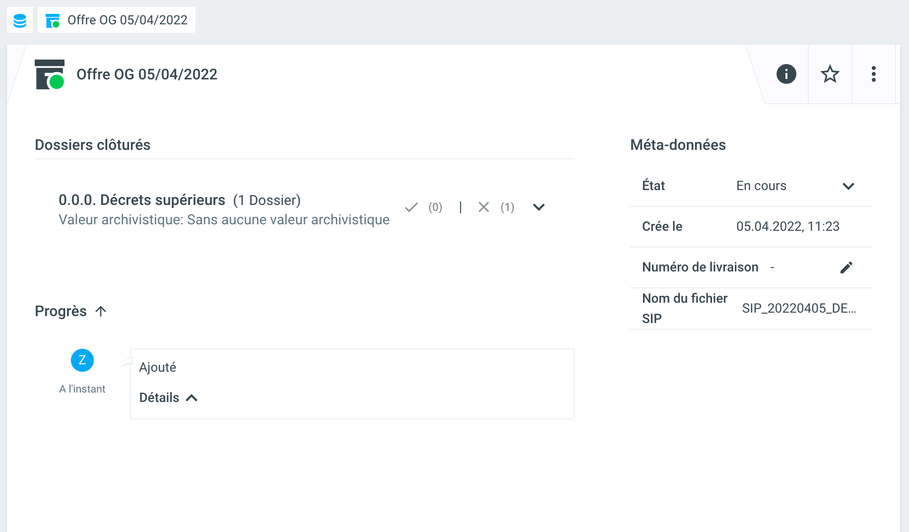 Depuis la version 2022.1.0, le journal des dossiers n'est plus créé lors de la clôture d'un dossier, mais seulement lors du triage. Celui-ci est contenu dans le paquet de livraison sous forme de fichier PDF et peut y être consulté.