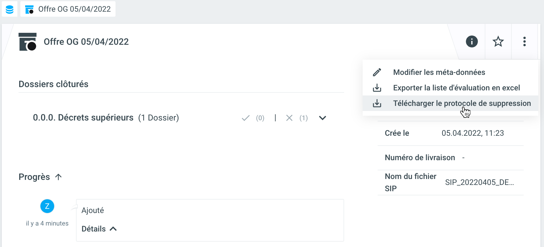 Une fois la requête terminée, c'est-à-dire après la destruction des dossiers, il est en outre possible de télécharger un protocole de suppression généré automatiquement. Vous trouverez l'option de menu correspondante sous les trois points (=actions supplémentaires).