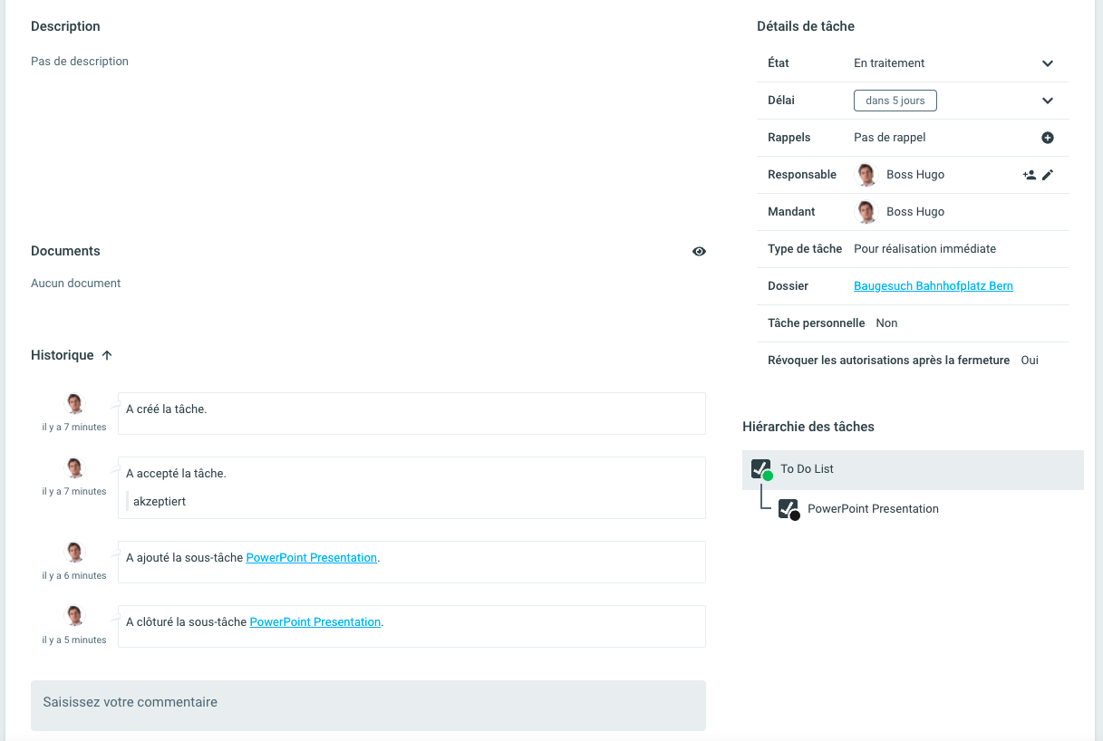 Après la sauvegarde, autant de sous-tâches que de destinataires saisis sont créées sous la tâche principale initialement créée. La sous-tâche est visible sur la tâche principale (et vice versa). Si vous souhaitez ajouter d'autres destinataires, vous pouvez répéter la délégation aussi souvent que vous le souhaitez.