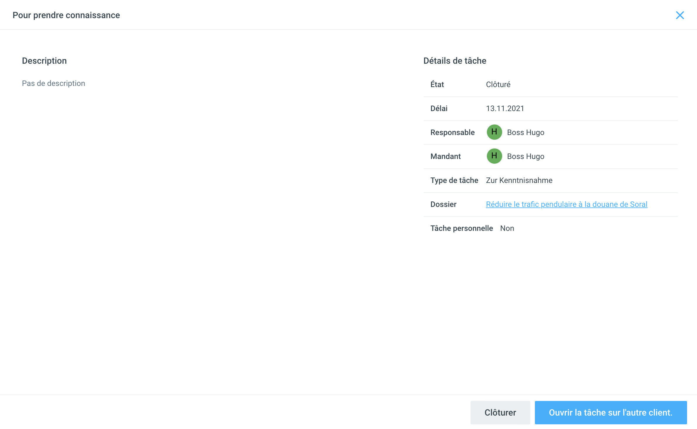 Si vous cliquez sur une tâche inter-clients (ou la notification correspondante) dans l'état Ouvrir, elle est affichée séparément dans une fenêtre modale.