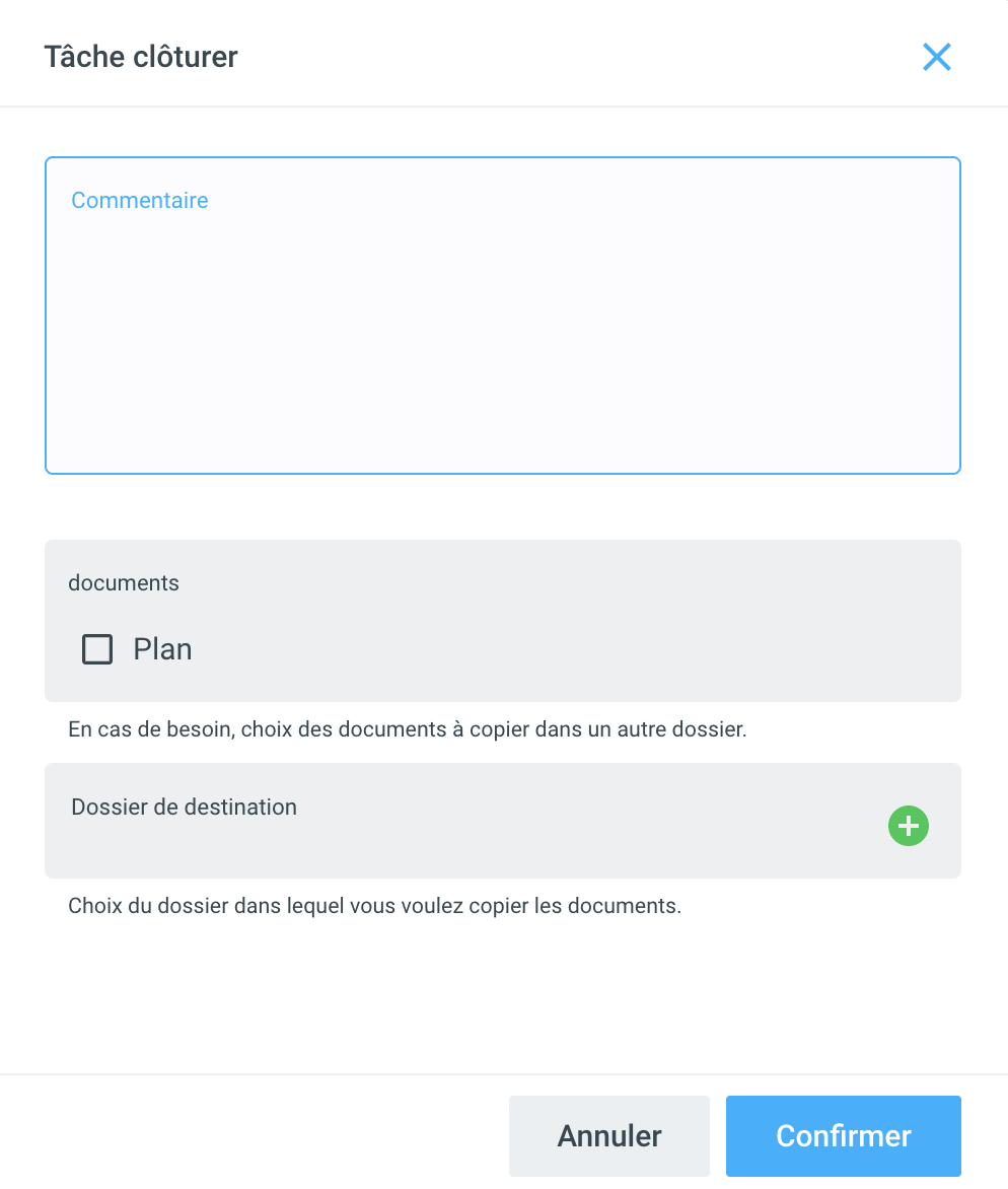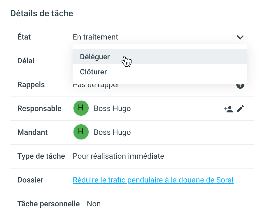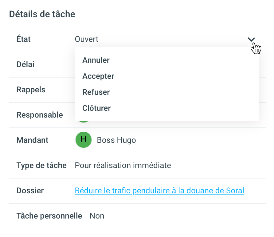 Dans le cas du type de tâche “Pour prendre connaissance", le mandataire peut compléter la tâche en cliquant sur le champ Etat et ensuite Clôturer.