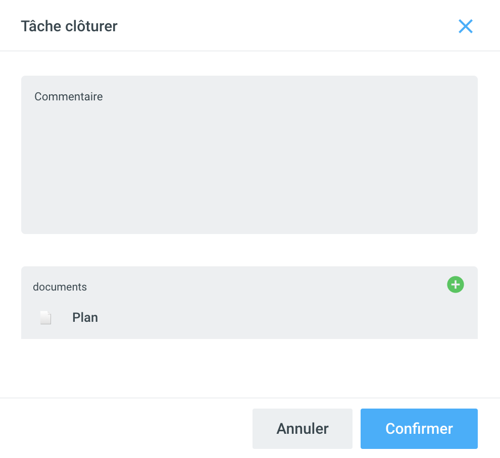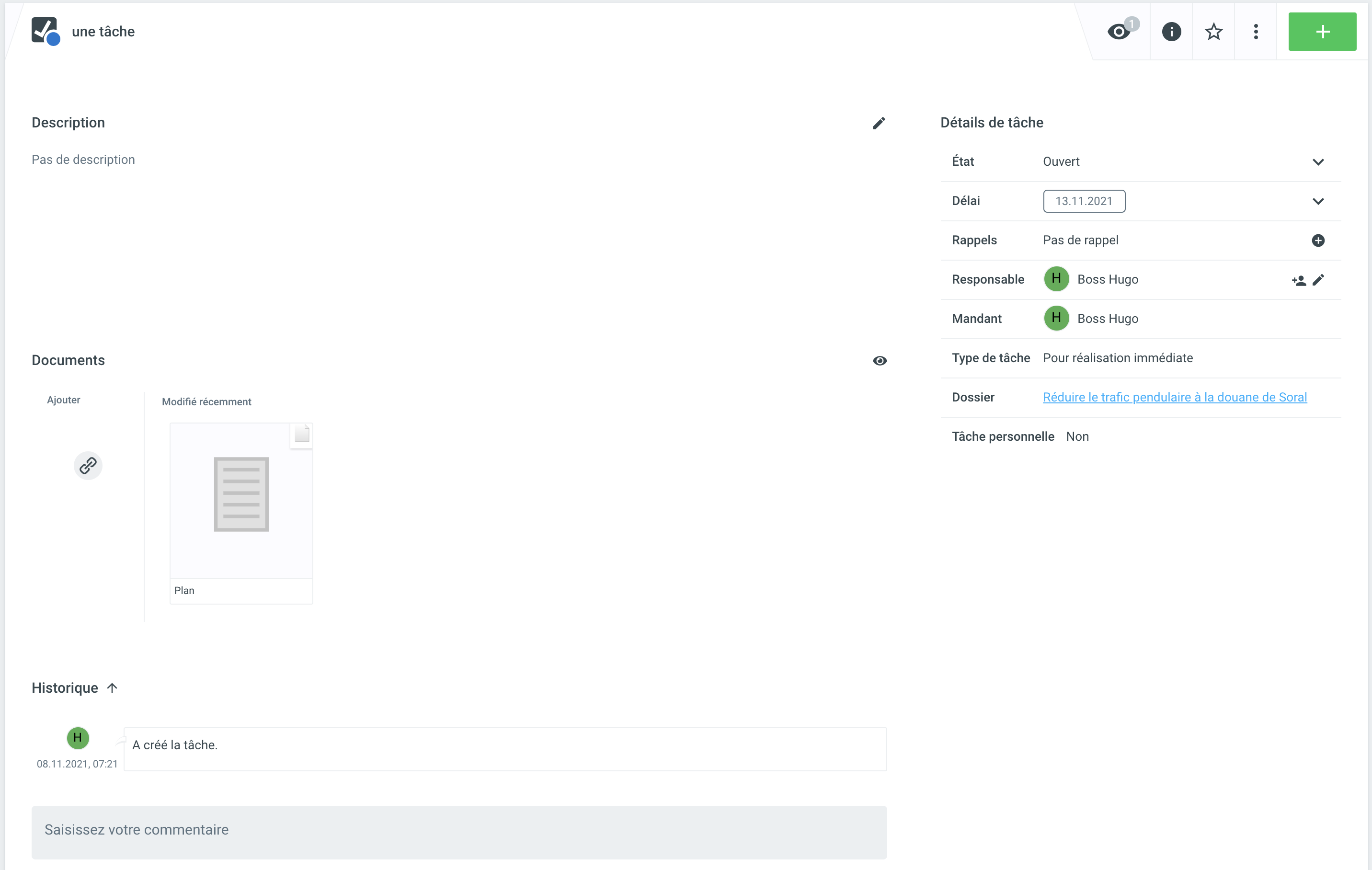Cliquez sur le symbole + et Document pour importer un fichier à partir du système de fichiers. Les documents nouvellement ajoutés sont également affichés dans la section Documents de la tâche. L'action est également indiquée dans l'historique.