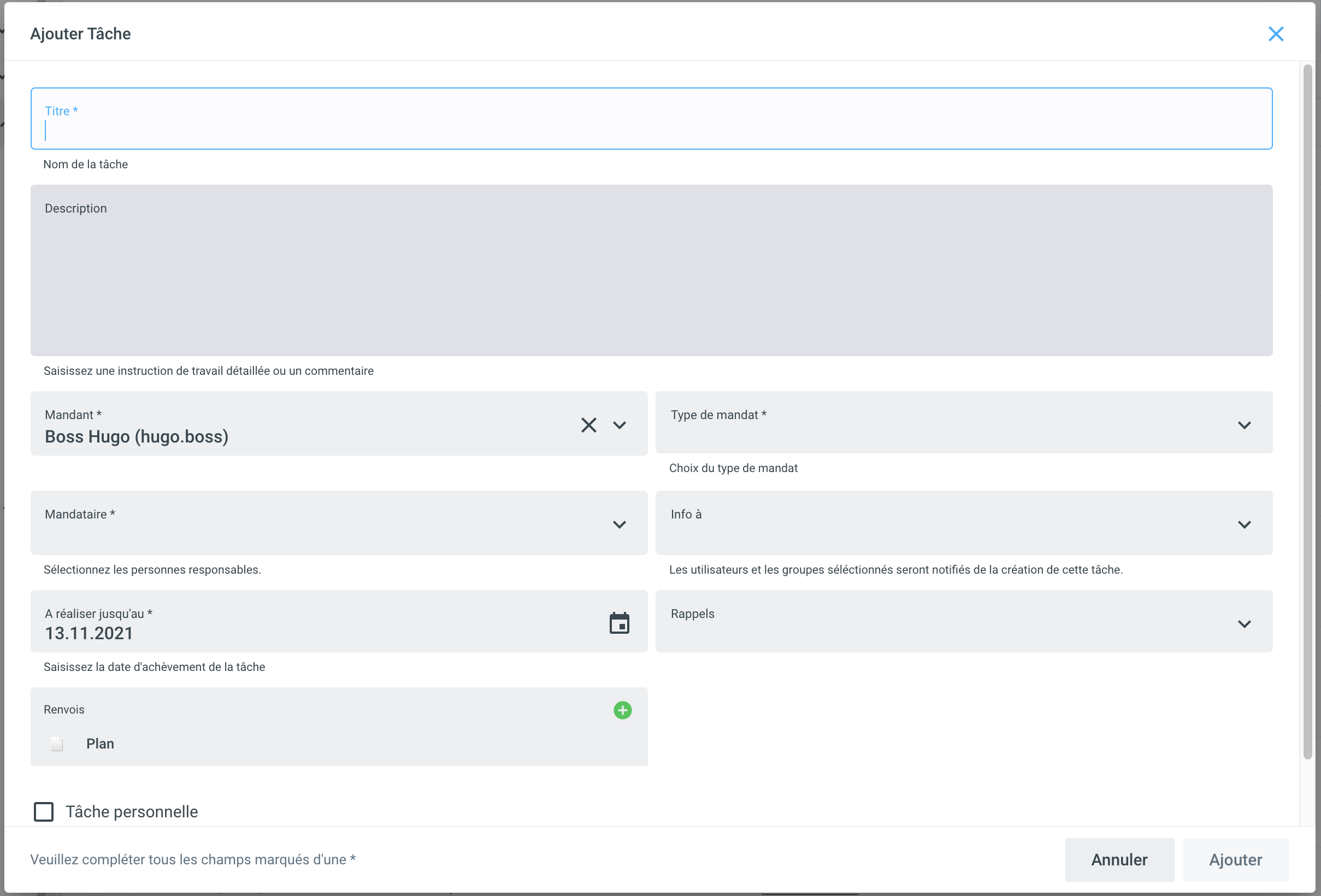 | La personne qui crée la tâche. Par défaut, la personne connectée au système est suggérée. |